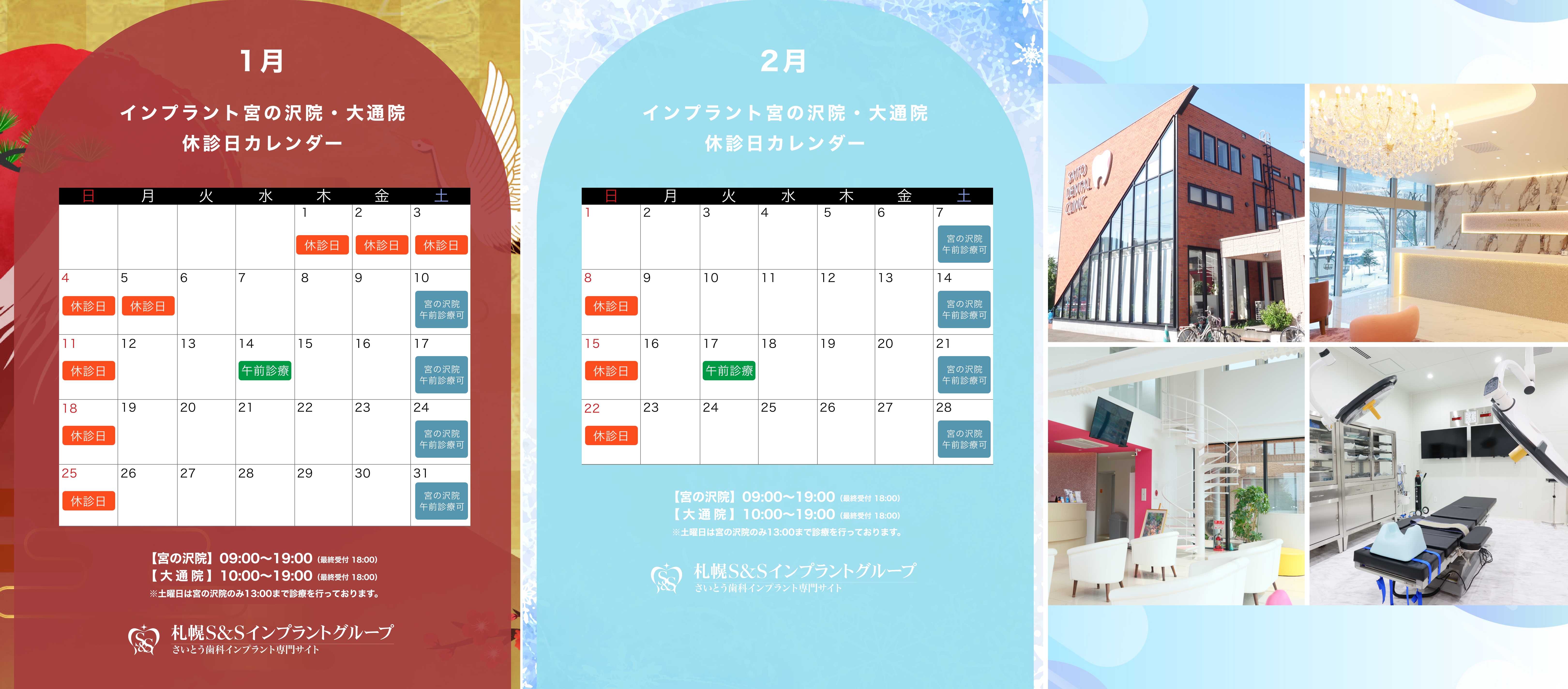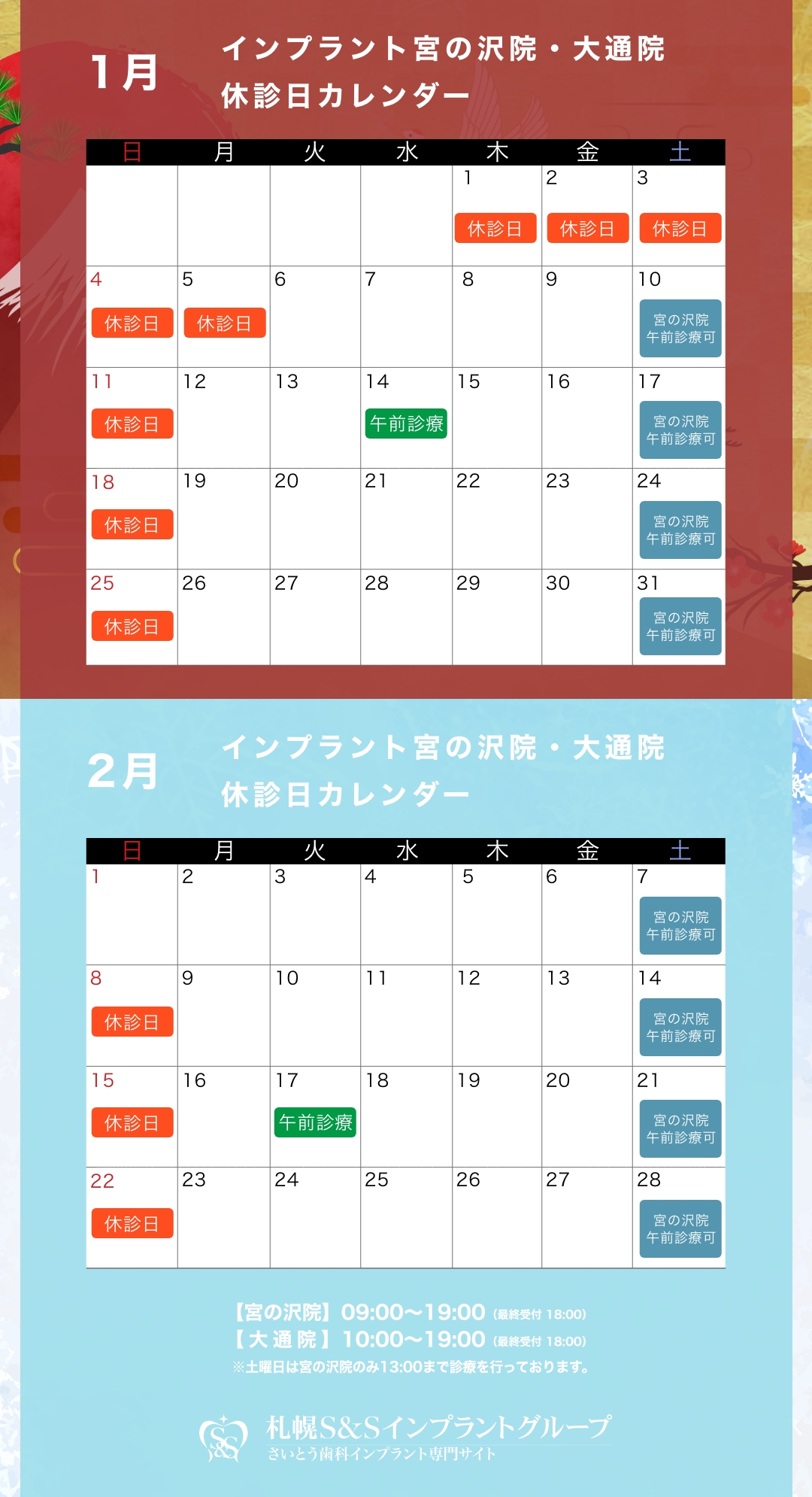 なお、9日(月・祝)成人の日は通常診療、26日(木)は午前診療のみとなっております。