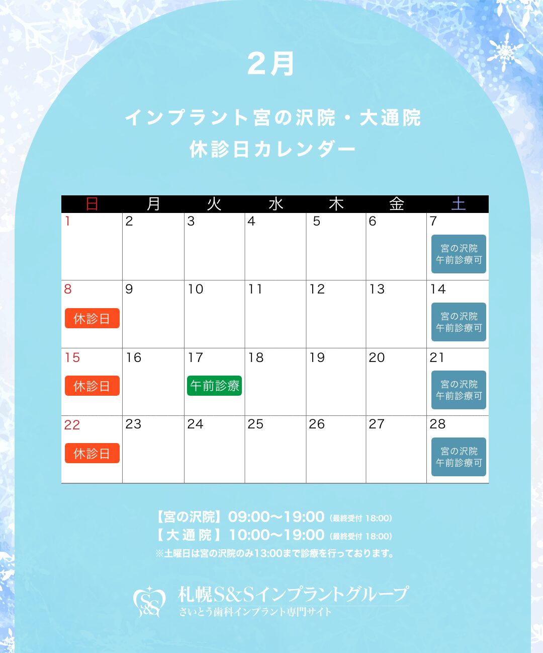 なお、12日(月・祝)建国記念の日、23日(金・祝)天皇誕生日は通常診療、22日(木)は午前診療のみとなっております。